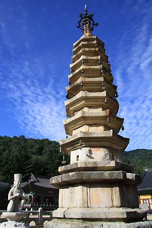 그 위에 탑신을 받았으니 탑신은 곧 부처님이다. 탑신 안에 부처님의 사리가 모셔져 있으니 불사리는 부처님의 진신이나 다를 바 없고 그러한 진신의 부처님이 연꽃 대좌 모양의 기단위에 계신것은 당연하다. 그리하여 기단 위에는 부처님을 앉히기 위한 방석과 같은 석재를 별도로 끼웠으며 탑 앞의 석조보살 좌상도 부처님과 같은 탑 앞에서 공양하는 자세를 하고 있다. 탑신은 각 층마다 줄어듦이 적고 층수는 구층을 헤아려 탑이 하늘을 향해 솟아오르는 느낌을 더해주고 있다. 팔각은 불교의 실천수행에 기본이 되는 팔정도八正道를 상징한다. 층마다 몸돌과 지붕돌은 각각 하나의 석재로 이루어지고 일층의 사면에는 네모난 감실이 하나씩 있는데, 남면의 감실이 가장 크며 문틀을 단 흔적도 있다. 몸돌은 모서리마다 귀기둥이 새겨지고 끝은 밑면이 수평이고 위는 곡면으로 처리하여 추녀 끝이 살짝 위로 솟아 가뜬해 보이며 추녀 끝마다 풍탁이 달려 탑은 언제나 바람의 향기를 음미한다. 흐트러짐이 없는 정연한 상륜은 보탑의 격조를 한층 더하여 주며, 여기에 금동장식을 더하여 탑 위에 보관을 얹은 듯 장엄한 분위기를 자아낸다. 그리하여 보탑의 절정부는 세련된 조형미를 유감없이 발휘 하였다. 여러 번의 화재로 인하여 1970년 해체보수를 통하여 1층 2층 6층 9층을 새 돌로 갈았으며 그 당시에 1층과 5층에서 총 12점의 사리구가 발견이 되었다. 은제의 불상 1구와 4점의 청동 거울, 금동 향합과 향주머니, 진신사리경 등의 총 12점의 유물들은 2003년 6월 보물로 일괄 지정되었다. 또한 2000년 8월 월정사석조보살좌상 보수공사 시에 지하 1m아래에서 탑의 기단부로 보이는 또 하나의 유구가 발견이 되어 학계의 반향을 불러일으키고 있다. 이 팔각구층석탑은 높이 15.2미터로 우리나라의 팔각석탑으로는 가장 크다. 고려시대 초기인 10세기경의 작품이며 국보 제 48호. |