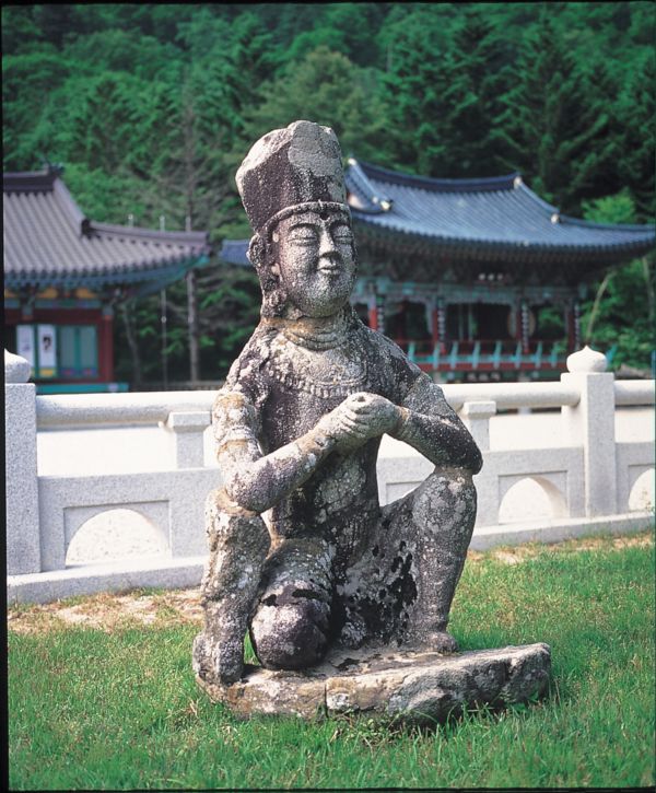부처님의 진신 사리를 모신 팔각구층석탑앞에는 탑을 향하여 오른쪽 무릎을 꿇고 두 손을 모으고 공양을 드리는 모습을 한 석조보살좌상이 있다.