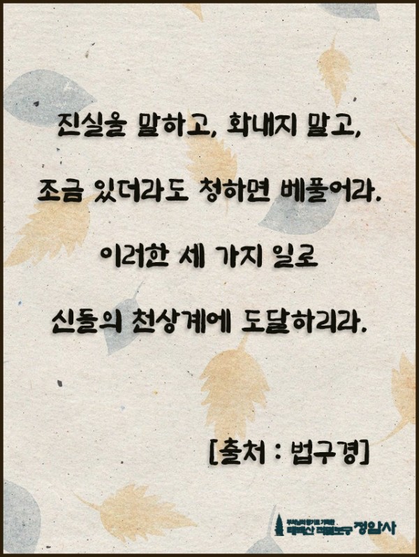 _()_ 붓다의 말씀 2023년 9월 - 진실을 말하고, 화내지 말고 페이지 정보 작성자 정암사 작성일23-09-01 22:35 조회6,826회 댓글0건 본문 . 댓글목록 등록된 댓글이 없습니다. 이전글 다음글 목록