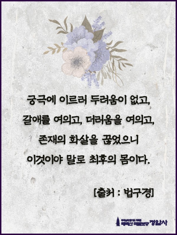 _()_ 붓다의 말씀 2024년 2월 - 궁극에 이르러 두려움이 없고... 페이지 정보 작성자 정암사 작성일24-02-02 09:43 조회7,383회 댓글0건 본문 . 댓글목록 등록된 댓글이 없습니다. 이전글 다음글 목록