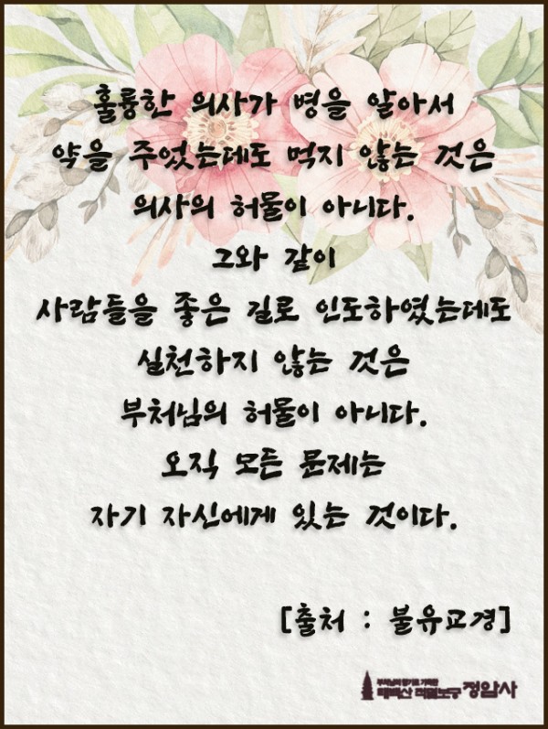 _()_ 붓다의 말씀 2024년 10월 - 훌륭한 의사가 병을 알아서 페이지 정보 작성자 정암사 작성일24-09-30 14:47 조회4,823회 댓글0건 본문 . 댓글목록 등록된 댓글이 없습니다. 이전글 다음글 목록