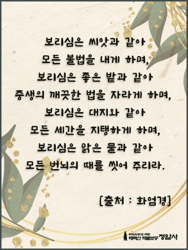 _()_ 붓다의 말씀 2023년 1월 - 보리심은 씨앗과 같아 페이지 정보 작성자 정암사 작성일22-12-27 16:22 조회7,598회 댓글0건 본문 . 댓글목록 등록된 댓글이 없습니다. 이전글 다음글 목록