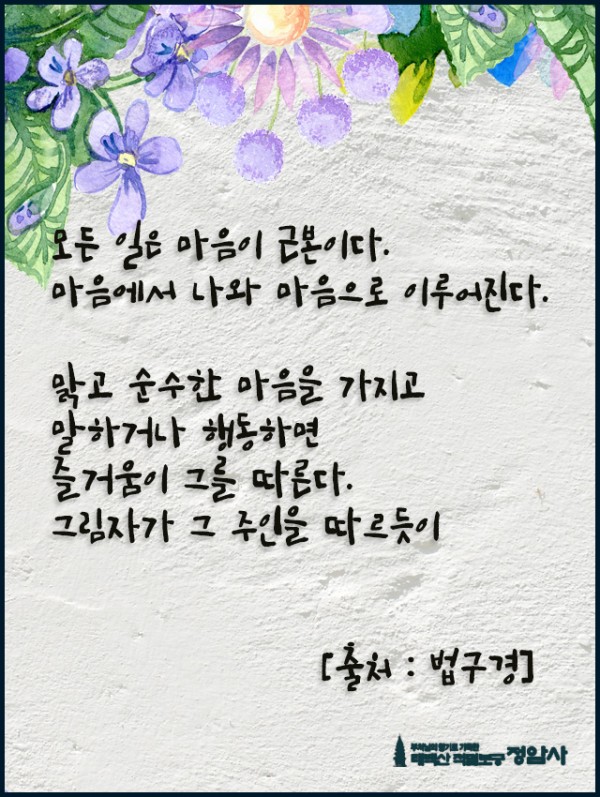_()_ 붓다의 말씀 2023년 7월 - 모든 일은 마음이 근본이다 페이지 정보 작성자 정암사 작성일23-06-29 22:22 조회6,922회 댓글0건 본문 . 댓글목록 등록된 댓글이 없습니다. 이전글 다음글 목록