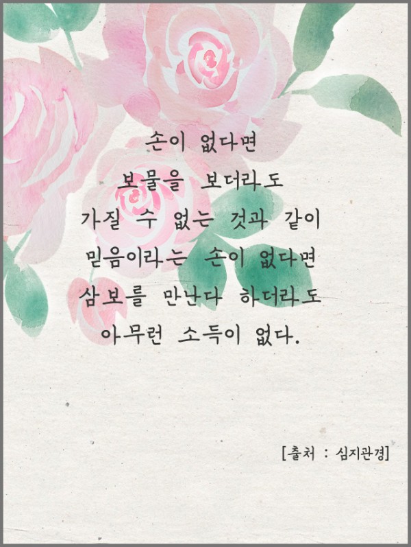 _()_ 붓다의 말씀 2021년 6월 - 손이 없다면 보물을 보더라도 가질 수 없는 것과 같이 페이지 정보 작성자 정암사 작성일21-05-27 11:55 조회10,630회 댓글0건 본문 . 댓글목록 등록된 댓글이 없습니다. 이전글 다음글 목록