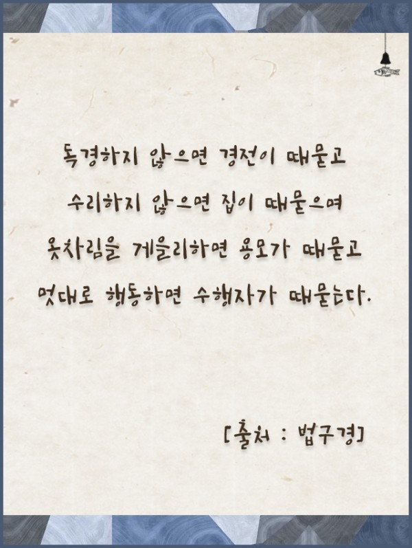 _()_ 붓다의 말씀 2020년 1월 - 독경하지 않으면 경전이 때묻고 페이지 정보 작성자 정암사 작성일19-12-26 15:00 조회10,774회 댓글0건 본문 댓글목록 등록된 댓글이 없습니다. 이전글 다음글 목록