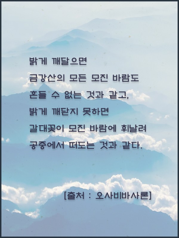 _()_ 붓다의 말씀 2019년 2월 - 밝게 깨달으면 금강산의 모진 바람도 페이지 정보 작성자 정암사 작성일19-01-29 15:22 조회10,450회 댓글0건 본문 댓글목록 등록된 댓글이 없습니다. 이전글 다음글 목록