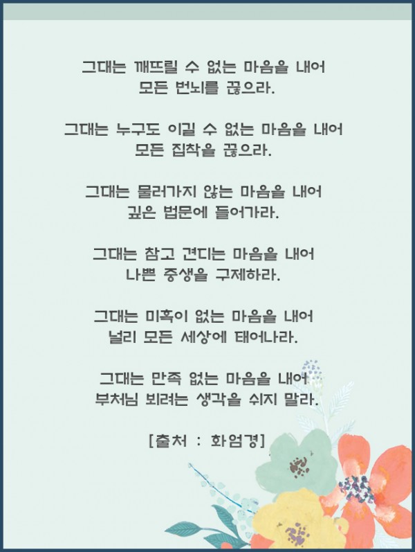 _()_ 붓다의 말씀 2017년 8월 - 그대는 깨뜨릴 수 없는 마음을 내어 모든 번뇌를 끊으라 페이지 정보 작성자 정암사 작성일17-07-25 16:24 조회11,891회 댓글0건 본문 댓글목록 등록된 댓글이 없습니다. 이전글 다음글 목록
