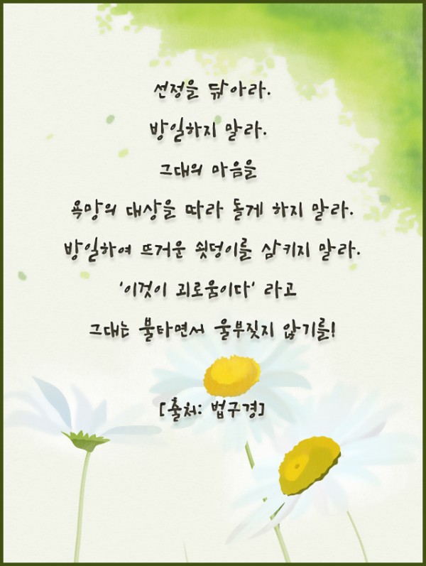 _()_ 붓다의 말씀 2018年 6月 - 선정을 닦아라. 방일하지 말라. 페이지 정보 작성자 정암사 작성일18-05-28 15:46 조회10,839회 댓글0건 본문 댓글목록 등록된 댓글이 없습니다. 이전글 다음글 목록