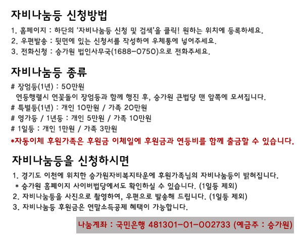 장애가족들을 위한 자비나눔 등을 밝혀주세요.. 페이지 정보 작성자 정암사 작성일12-04-26 18:35 조회9,900회 댓글0건 본문 장애가족 행복 지킴이. 자비나눔 승가원http://202.68.237.32/MyPage/MercyLanterninfo.aspx 댓글목록 등록된 댓글이 없습니다. 이전글 다음글 목록