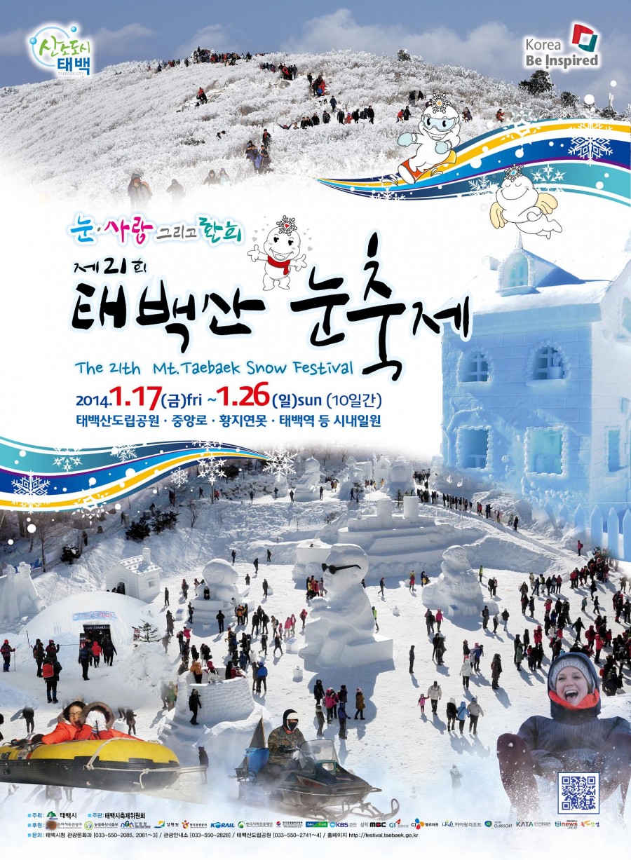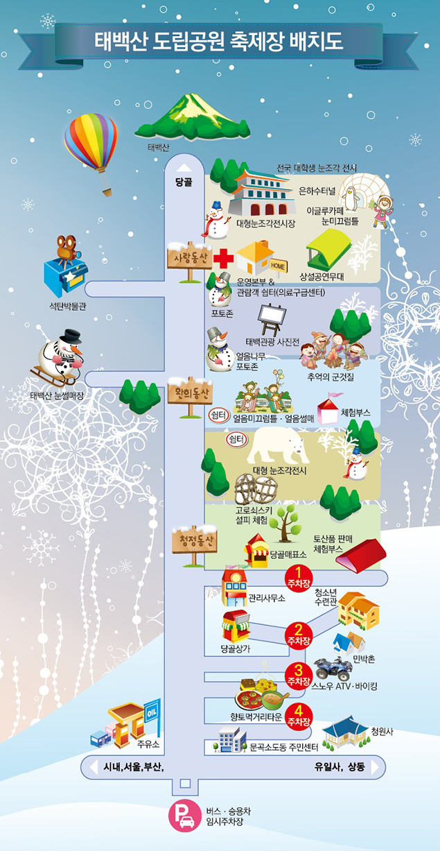 이번 태백산 눈축제 주제는 눈, 사랑 그리고 환희다. ’설(雪)임의 초대, 힐링 태백’이란 콘셉트로 진행되는 이번 축제는 태백산도립공원, 중앙로, 황지연못, 태백역 등 태백 시내 일원에서 열린다. 개막일은 오는 17일이며 26일 막을 내린다.