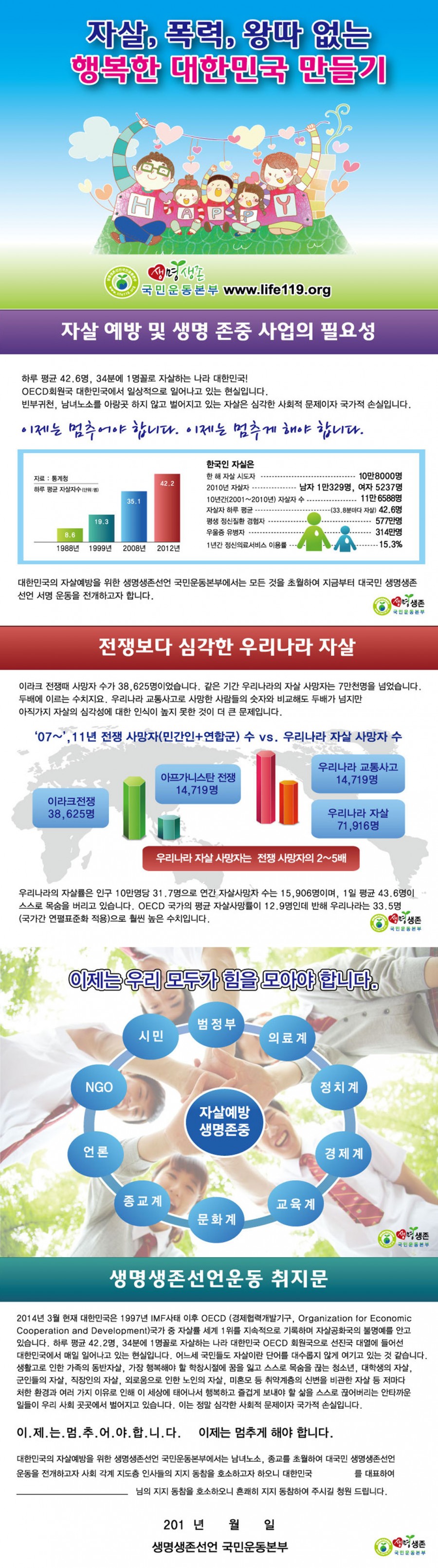 안녕하세요, 자살,폭력, 왕따없는 행복한 대한민국 만들기를 위한 생명생존 국민운동본부 입니다.