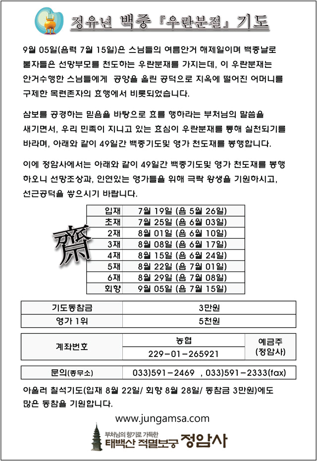 정유년 백중기도 및 칠석기도 봉행 페이지 정보 작성자 정암사 작성일17-05-24 16:07 조회11,095회 댓글0건 본문 . 댓글목록 등록된 댓글이 없습니다. 이전글 다음글 목록
