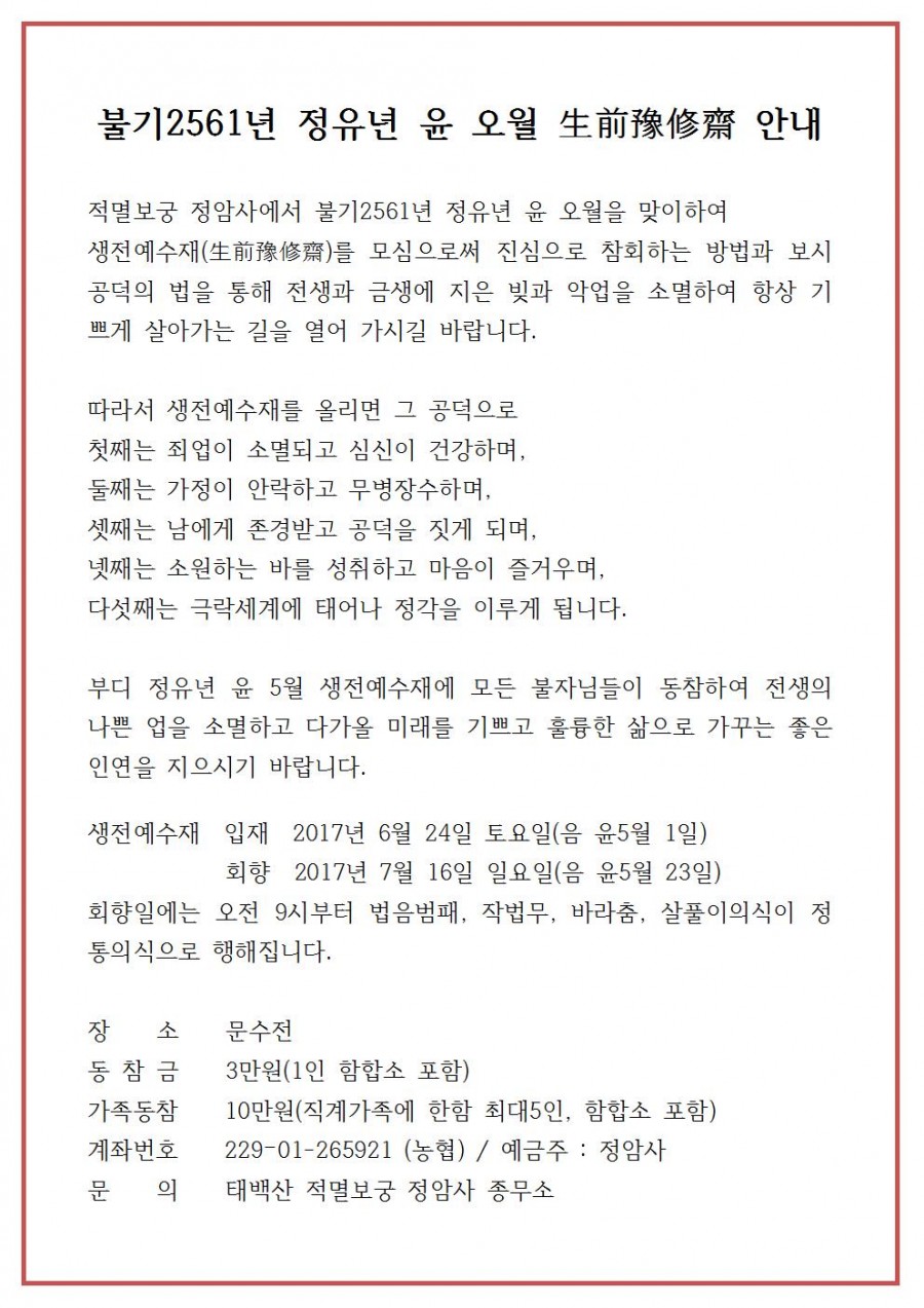 정유년 윤 오월 생전예수재(生前豫修齋) 봉행 페이지 정보 작성자 정암사 작성일17-06-07 12:55 조회10,651회 댓글0건 본문 . 댓글목록 등록된 댓글이 없습니다. 이전글 다음글 목록