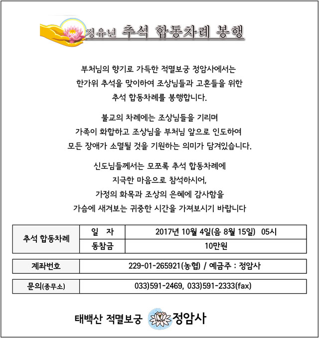 불기 2561(2017)년 추석 합동차례 봉행 페이지 정보 작성자 정암사 작성일17-09-06 13:39 조회10,367회 댓글0건 본문 . 댓글목록 등록된 댓글이 없습니다. 이전글 다음글 목록