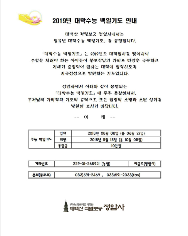 2019년 대학수능 백일기도 봉행 > 공지사항