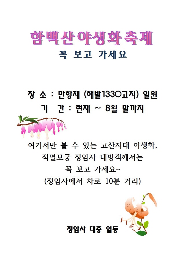 '함백산 야생화 축제' 꼭 보고 가세요 페이지 정보 작성자 정암사 작성일18-08-01 13:39 조회9,322회 댓글0건 본문 . 댓글목록 등록된 댓글이 없습니다. 이전글 다음글 목록