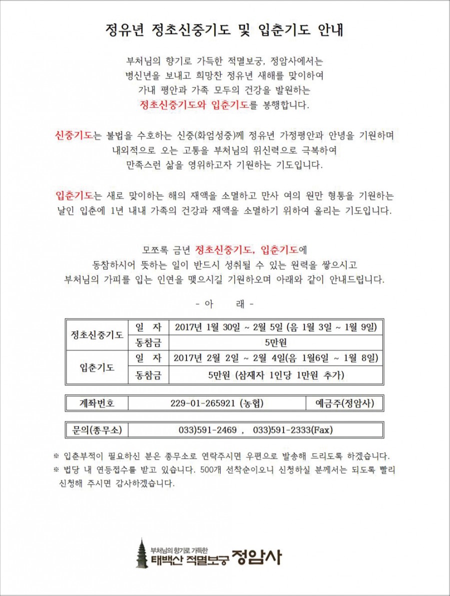 정유년 정초신중기도 및 입춘기도 봉행 페이지 정보 작성자 정암사 작성일16-12-24 09:11 조회10,519회 댓글0건 본문 . 댓글목록 등록된 댓글이 없습니다. 이전글 다음글 목록
