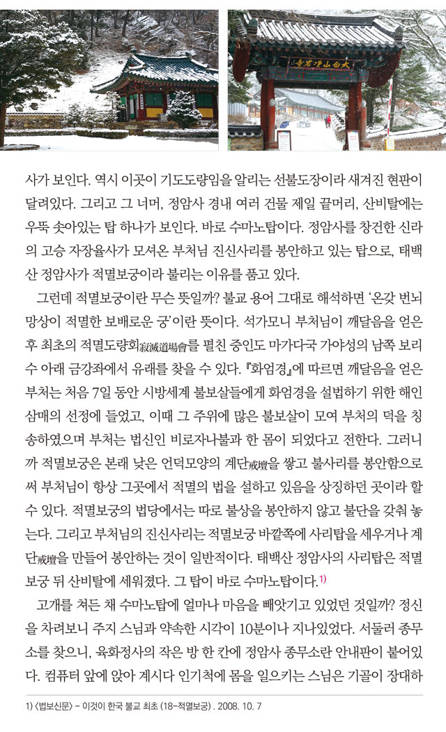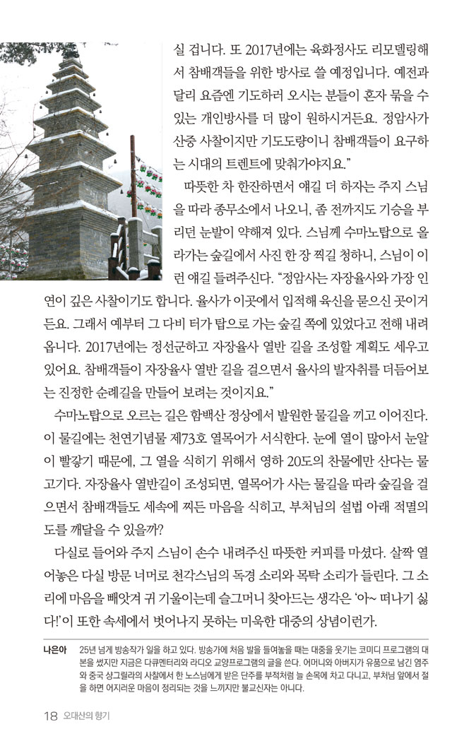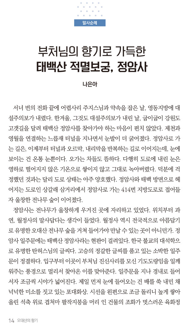 오대산향기 1월호 말사순례_부처님의 향기로 가득한 태백산 적멸보궁 정암사 페이지 정보 작성자 정암사 작성일17-01-18 13:57 조회10,786회 댓글0건 본문 . 댓글목록 등록된 댓글이 없습니다. 이전글 다음글 목록