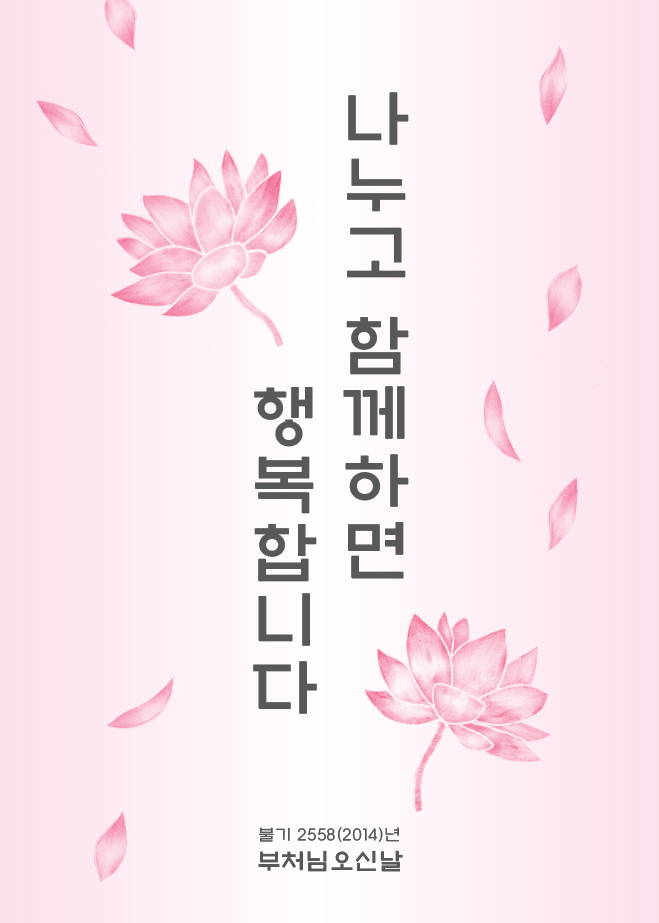 1. 부처님오신날 봉축위원회(위원장 자승스님)는 오는 5월 6일(화) 부처님오신날을 맞아 봉축표어로 ‘나누고 함께하면 행복합니다’로 선정 발표하였습니다.