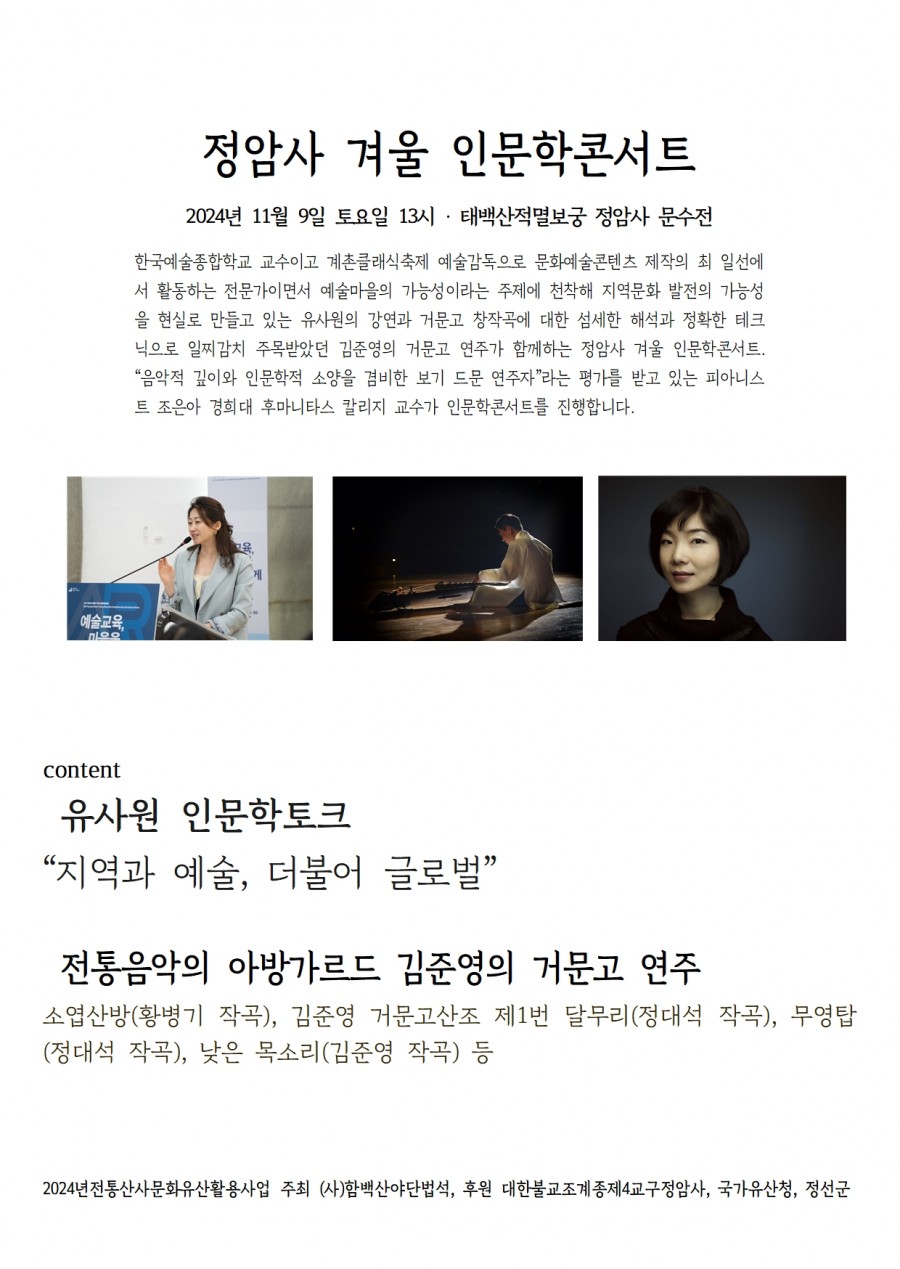 정암사 겨울 인문학 콘서트_ 2024년 11월 9일(토) 13시 페이지 정보 작성자 정암사 작성일24-11-05 10:57 조회4,699회 댓글0건 본문 . 댓글목록 등록된 댓글이 없습니다. 이전글 다음글 목록
