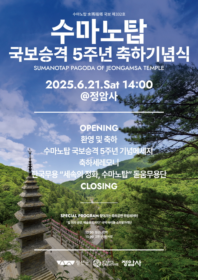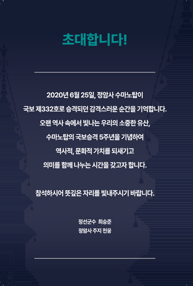 수마노탑 국보승격 5주년 축하기념식에 초대합니다(25.06.21,토) 페이지 정보 작성자 정암사 작성일25-05-20 14:43 조회7,517회 댓글0건 본문 댓글목록 등록된 댓글이 없습니다. 이전글 다음글 목록