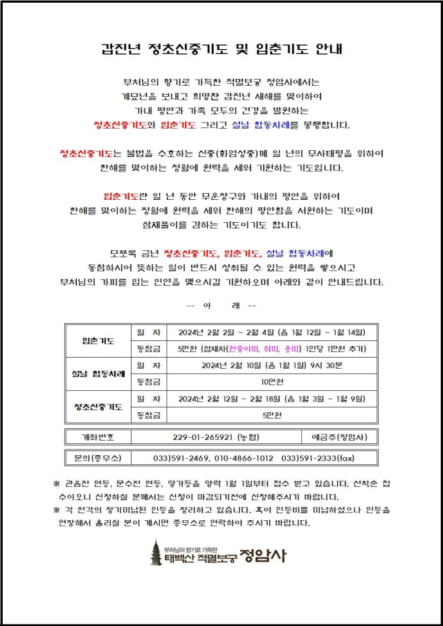 갑진년 입춘기도, 설날합동다럐재 및 정초신중기도 봉행 페이지 정보 작성자 정암사 작성일23-12-31 10:37 조회6,016회 댓글0건 본문 . 댓글목록 등록된 댓글이 없습니다. 이전글 다음글 목록