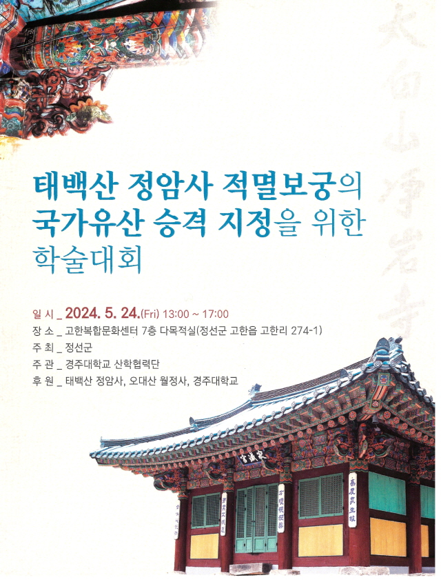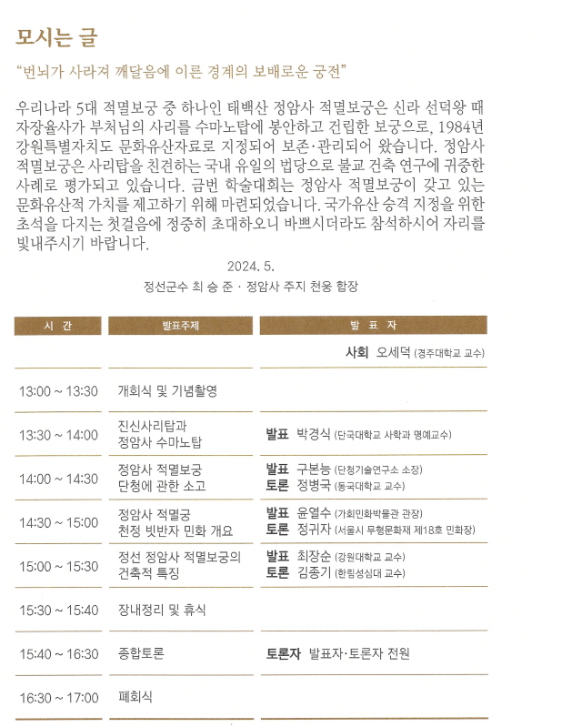 태백산 정암사 적멸보궁의 국가유산 승격 지정을 위한 학술대회 페이지 정보 작성자 정암사 작성일24-05-22 14:34 조회5,626회 댓글0건 본문 . 댓글목록 등록된 댓글이 없습니다. 이전글 다음글 목록