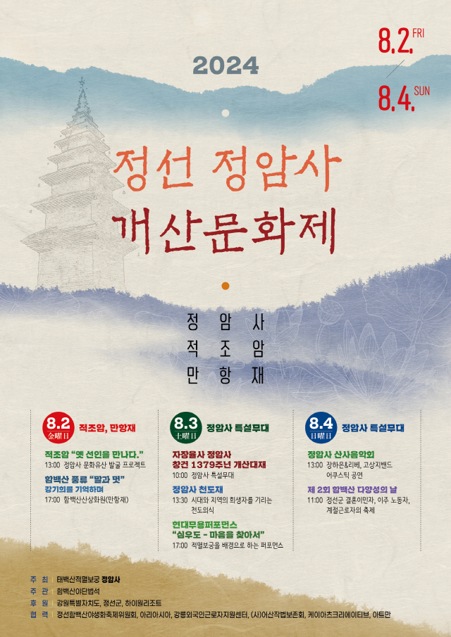 2024 정선 정암사 개산문화제(8.2~8.4) 페이지 정보 작성자 정암사 작성일24-07-15 12:59 조회4,920회 댓글0건 본문 . 댓글목록 등록된 댓글이 없습니다. 이전글 다음글 목록