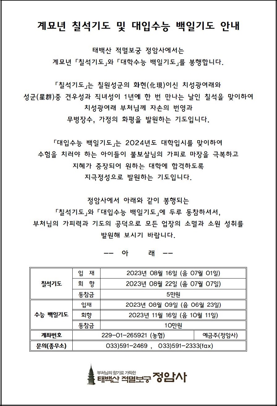 계묘년 칠석기도 및 대입수능 백일기도 봉행 페이지 정보 작성자 정암사 작성일23-07-25 14:47 조회5,914회 댓글0건 본문 . 댓글목록 등록된 댓글이 없습니다. 이전글 다음글 목록