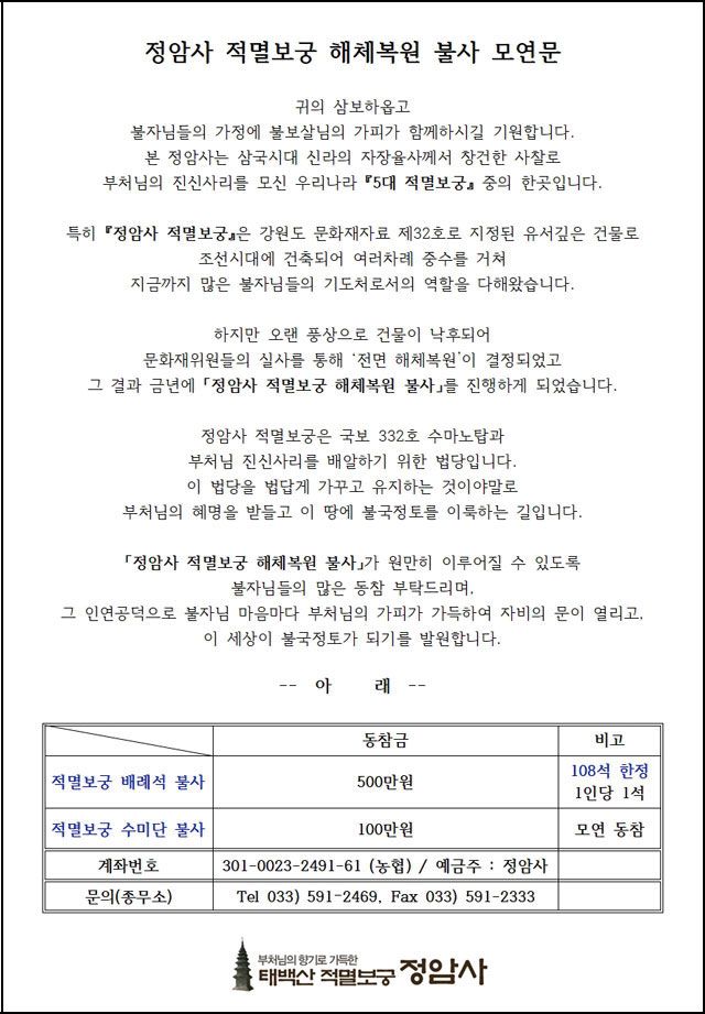 정암사 적멸보궁 해체복원 불사 모연 페이지 정보 작성자 정암사 작성일21-04-12 15:18 조회16,830회 댓글0건 본문 . 댓글목록 등록된 댓글이 없습니다. 이전글 다음글 목록