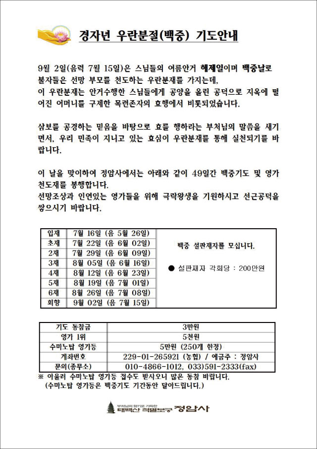경자년 백중 (우란분절) 기도안내 페이지 정보 작성자 정암사 작성일20-06-13 08:55 조회11,940회 댓글0건 본문 . 댓글목록 등록된 댓글이 없습니다. 이전글 다음글 목록