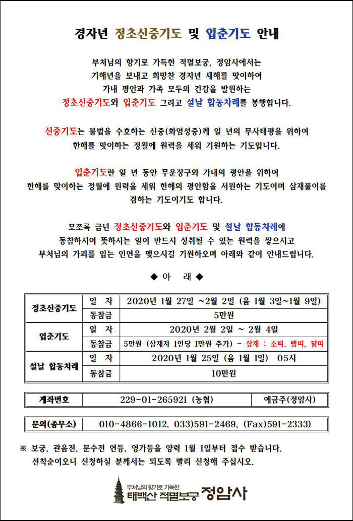 경자년 정초신중기도 및 입춘기도 안내 페이지 정보 작성자 정암사 작성일20-01-05 15:01 조회10,929회 댓글0건 본문 . 댓글목록 등록된 댓글이 없습니다. 이전글 다음글 목록