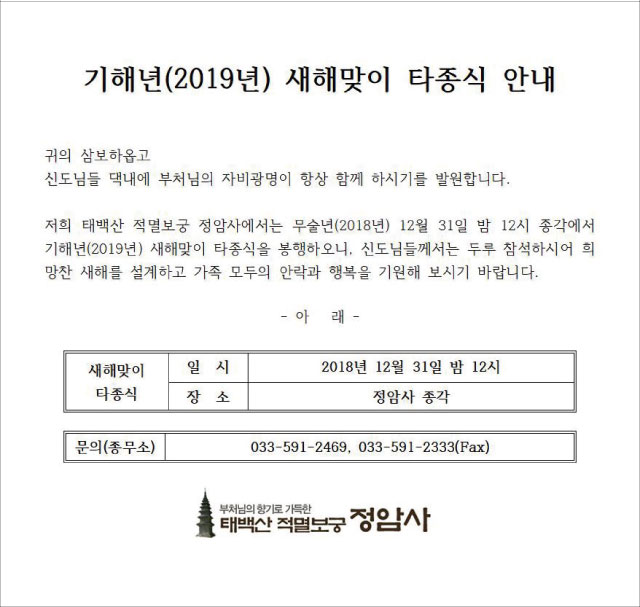 기해년(2019년) 새해맞이 타종식 봉행 페이지 정보 작성자 정암사 작성일18-11-28 09:26 조회9,373회 댓글0건 본문 . 댓글목록 등록된 댓글이 없습니다. 이전글 다음글 목록