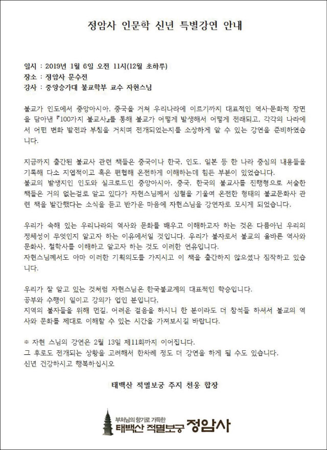 『정암사 인문학 신년 특별강연』_1월 6일(음 12.1) 오전 11시 페이지 정보 작성자 정암사 작성일18-12-28 13:18 조회9,145회 댓글0건 본문 . 댓글목록 등록된 댓글이 없습니다. 이전글 다음글 목록
