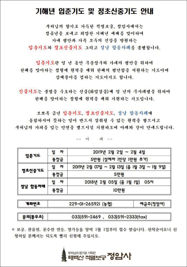 기해년 입춘기도 및 정초신중기도 봉행 페이지 정보 작성자 정암사 작성일18-12-28 12:54 조회9,458회 댓글0건 본문 . 댓글목록 등록된 댓글이 없습니다. 이전글 다음글 목록
