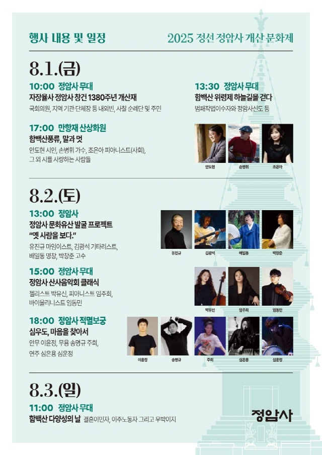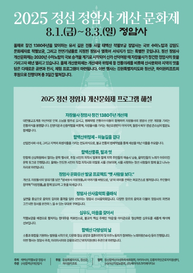 2025 정선 정암사 개산문화제_2025.8.1~8.3 페이지 정보 작성자 정암사 작성일25-07-18 12:55 조회3,133회 댓글0건 본문 . 댓글목록 등록된 댓글이 없습니다. 이전글 다음글 목록