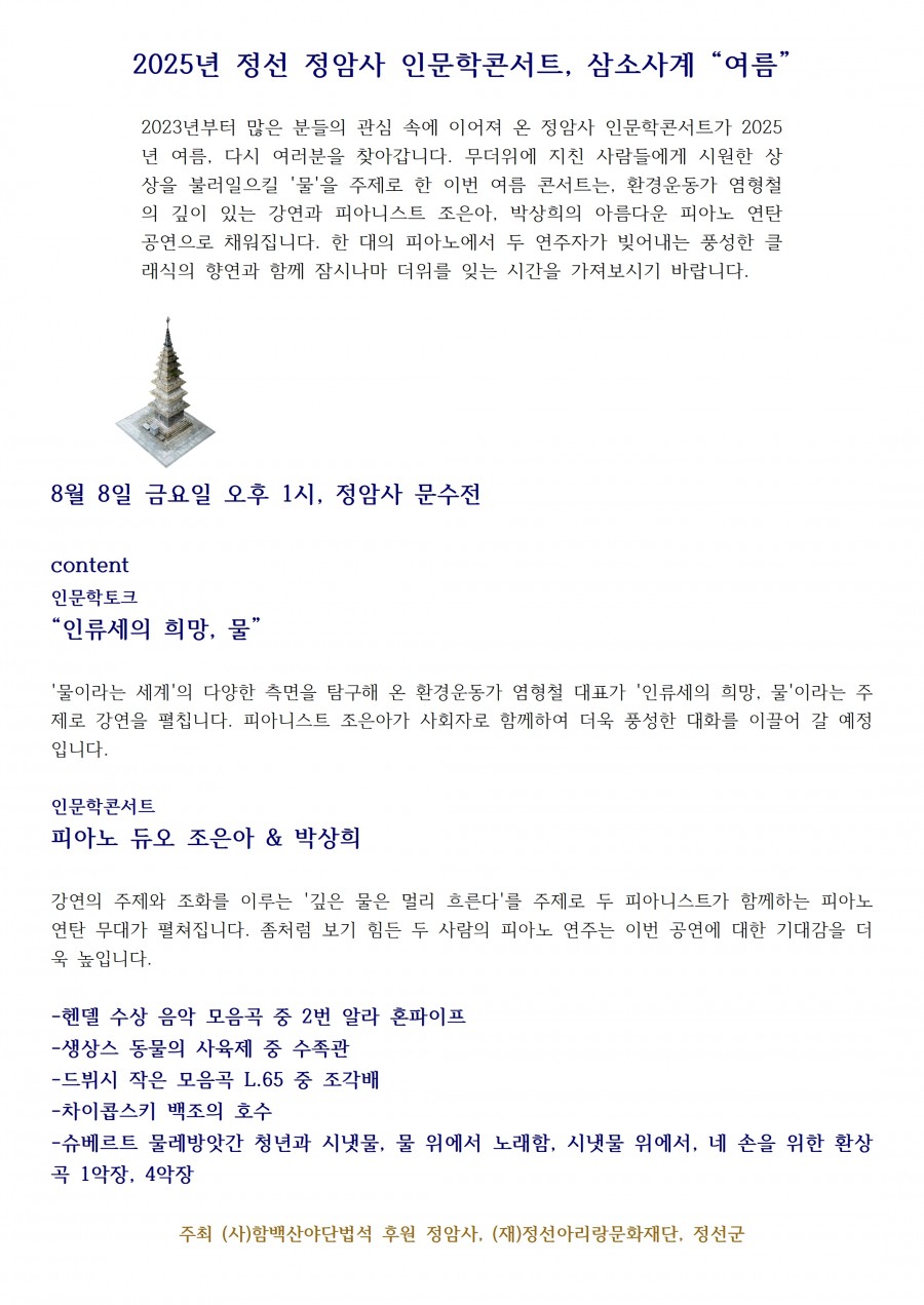 2025년 정암사 삼소사계 여름 인문학콘서트 페이지 정보 작성자 정암사 작성일25-08-04 15:59 조회3,168회 댓글0건 본문 . 댓글목록 등록된 댓글이 없습니다. 이전글 다음글 목록