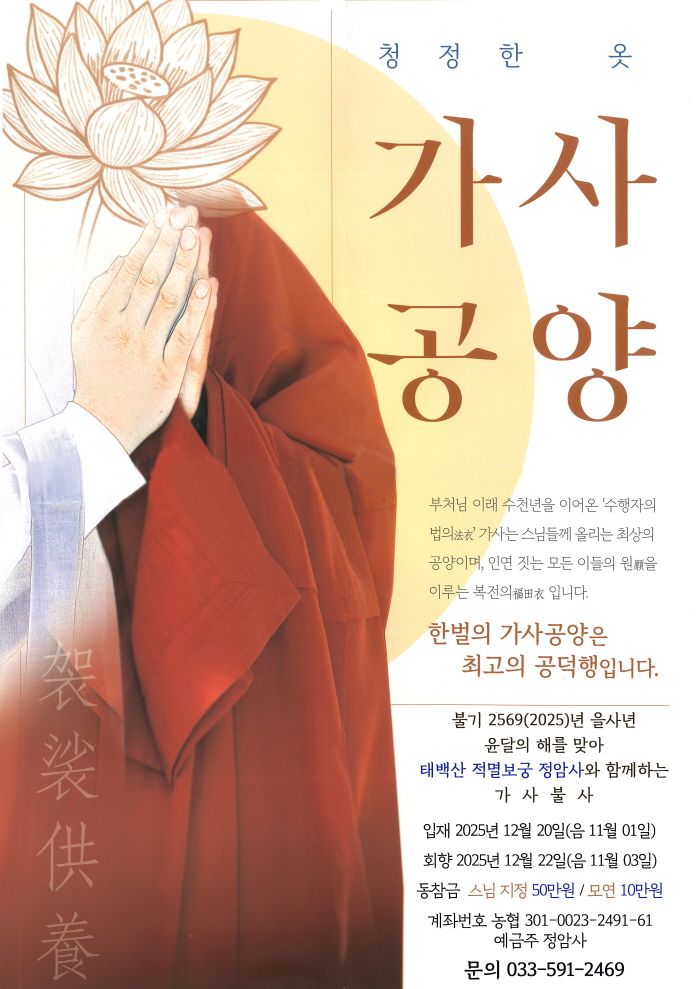 을사년 윤달의 해에 가사공양 올리세요 페이지 정보 작성자 정암사 작성일25-08-18 10:35 조회3,912회 댓글0건 본문 . 댓글목록 등록된 댓글이 없습니다. 이전글 다음글 목록