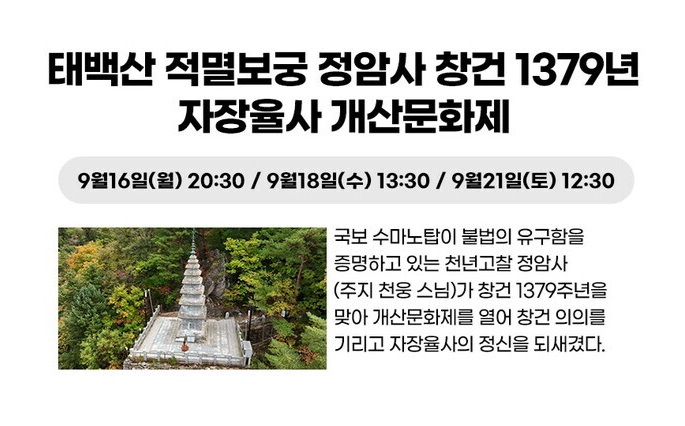 BBS불교방송 방영안내_ 정암사 창건 1979년 자장율사 개산문화제 페이지 정보 작성자 정암사 작성일24-09-17 14:49 조회9,048회 댓글0건 본문 . 댓글목록 등록된 댓글이 없습니다. 이전글 다음글 목록